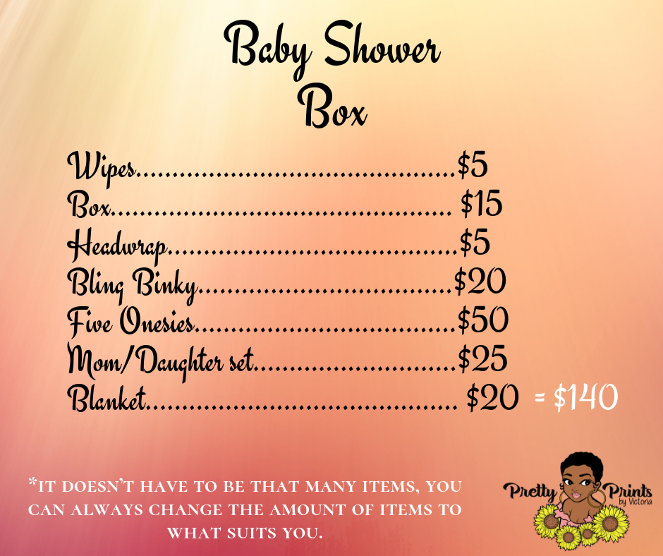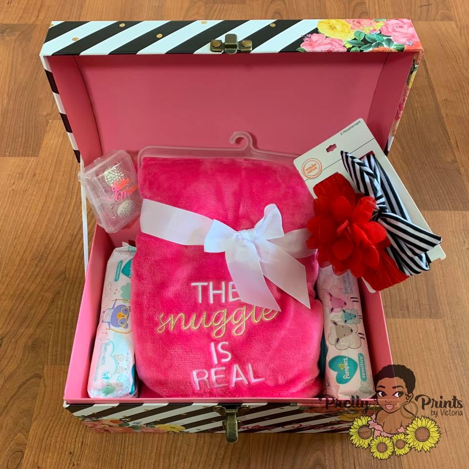 The Baby Shower box is always a hit at baby showers, each item can be personalized so please send us a message specifying what you want on each piece!