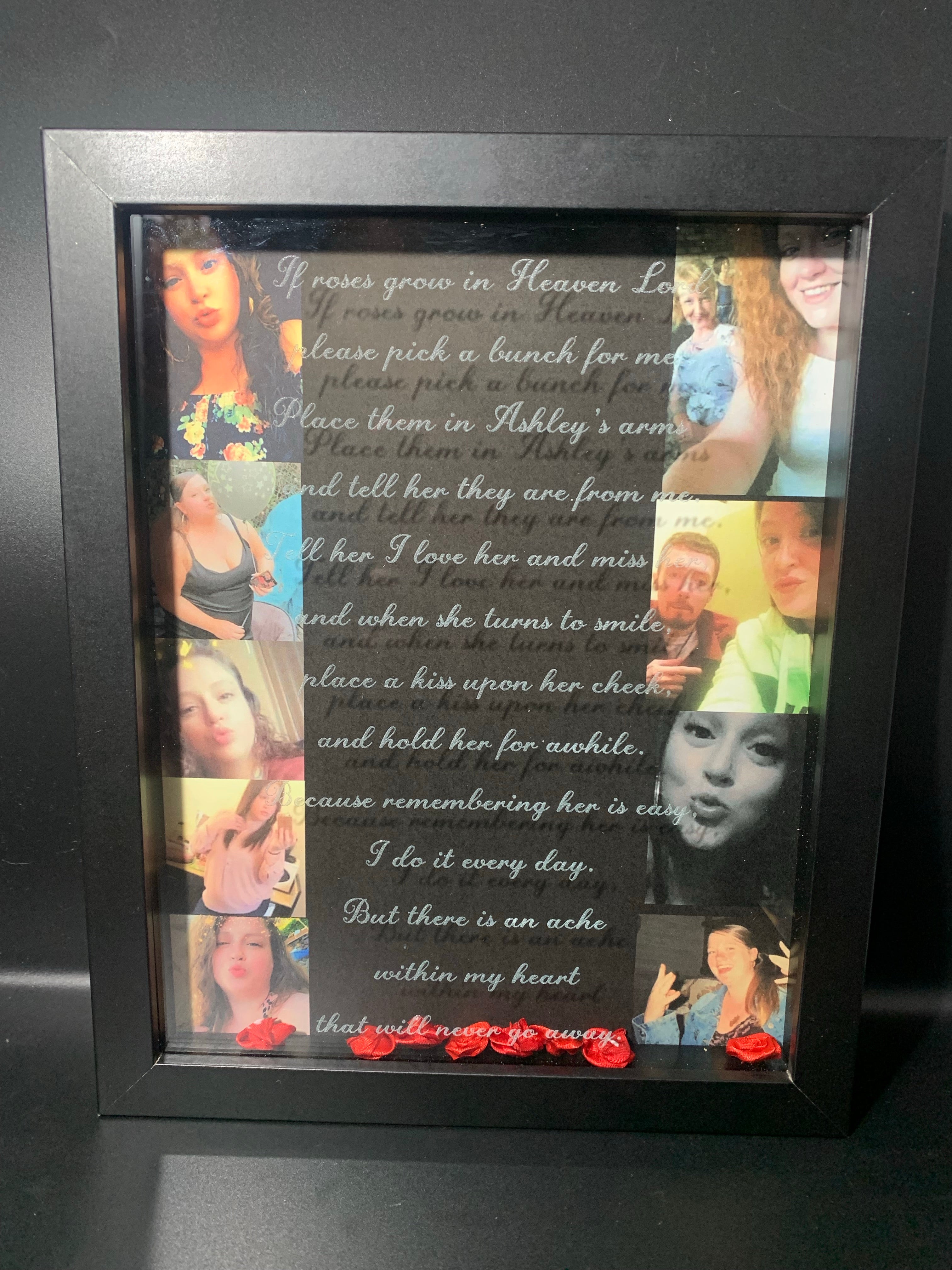 A beautiful way to memorialize your friend or family member. Your frame will be personalized with your loved one's name and 8-12 photos of your choice.