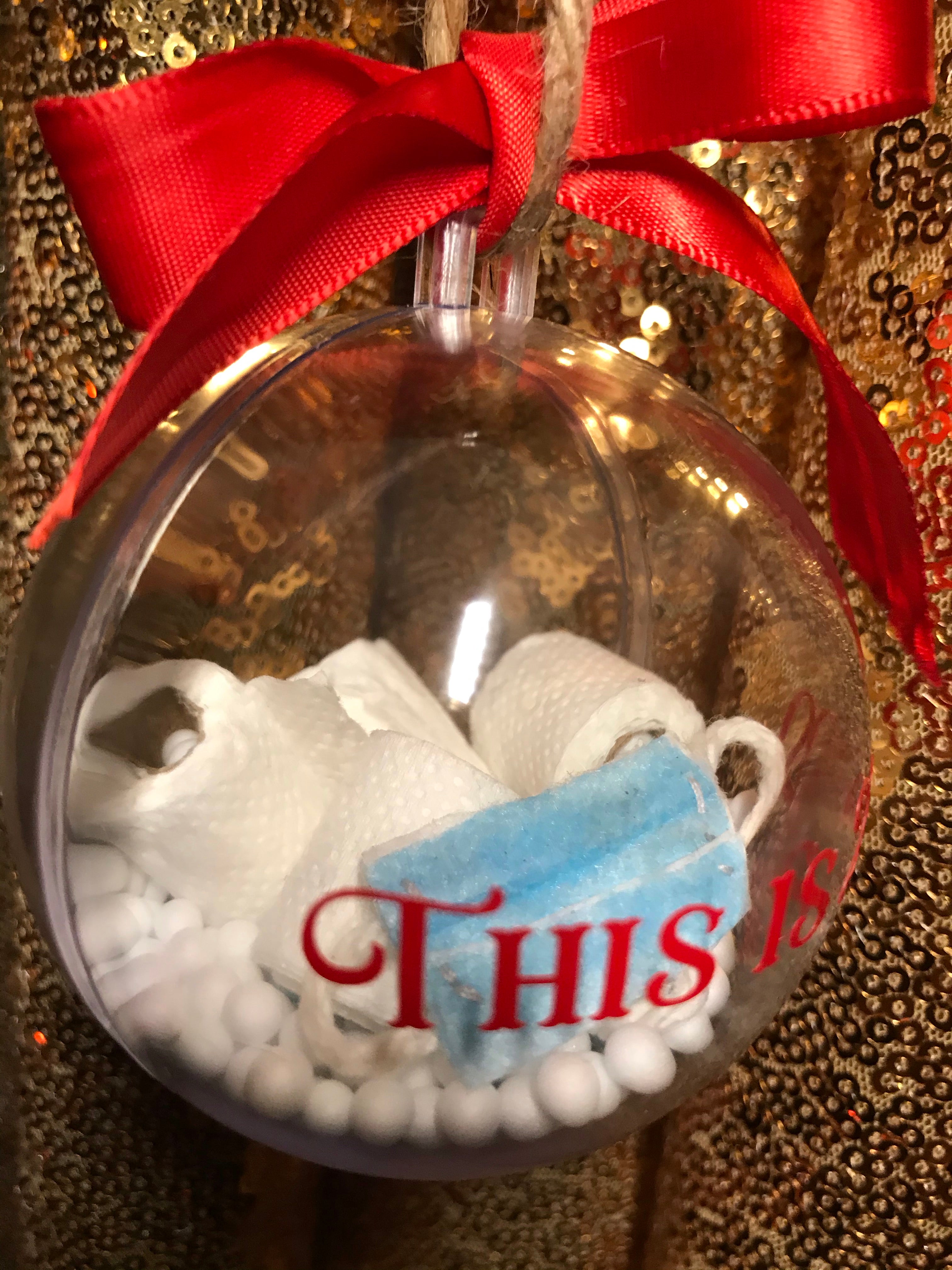 Handcrafted mini masks and mini toilet paper rolls inside of anadorned with a bow and 2020 keepsake charm.